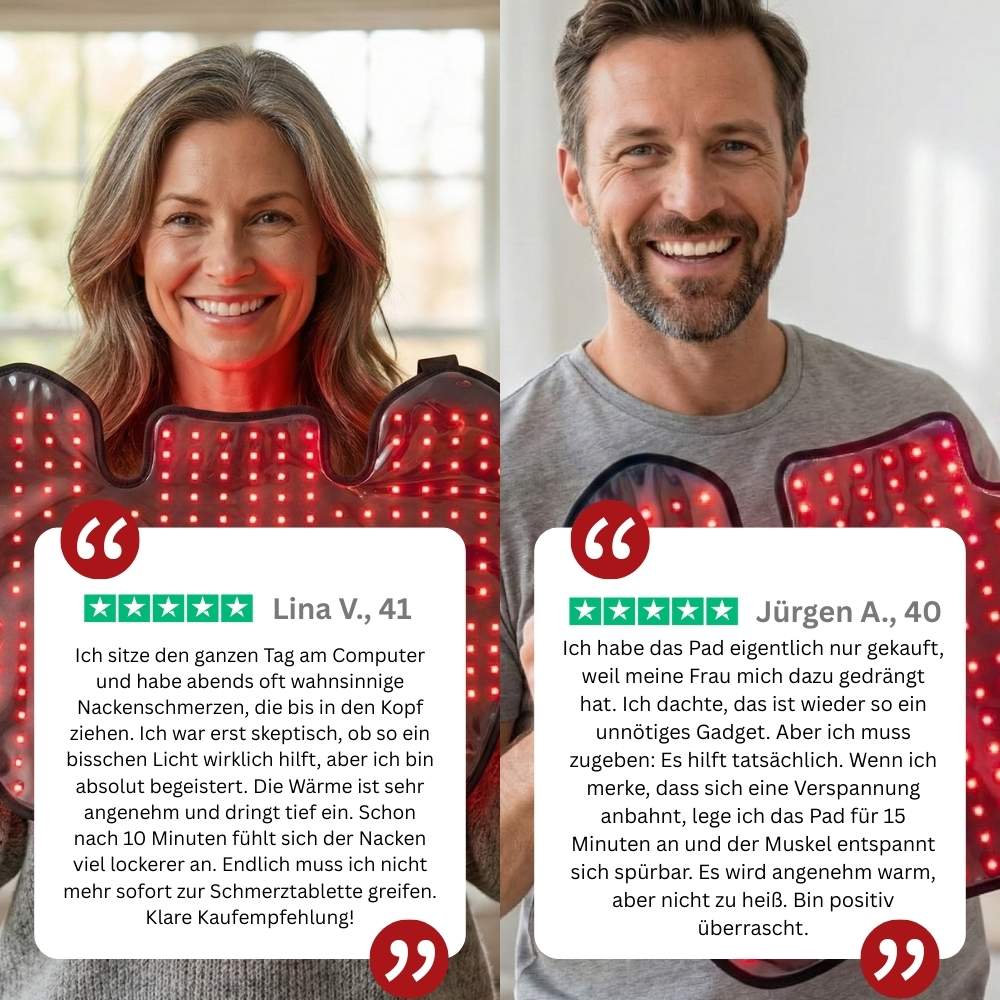 „Ich hätte nicht gedacht, dass Rotlicht so viel hilft. Nach jahrelangen Nackenschmerzen spüre ich schon nach nur einer Woche deutlich weniger Verspannungen. Ich nutze es täglich und bin echt zufrieden.“